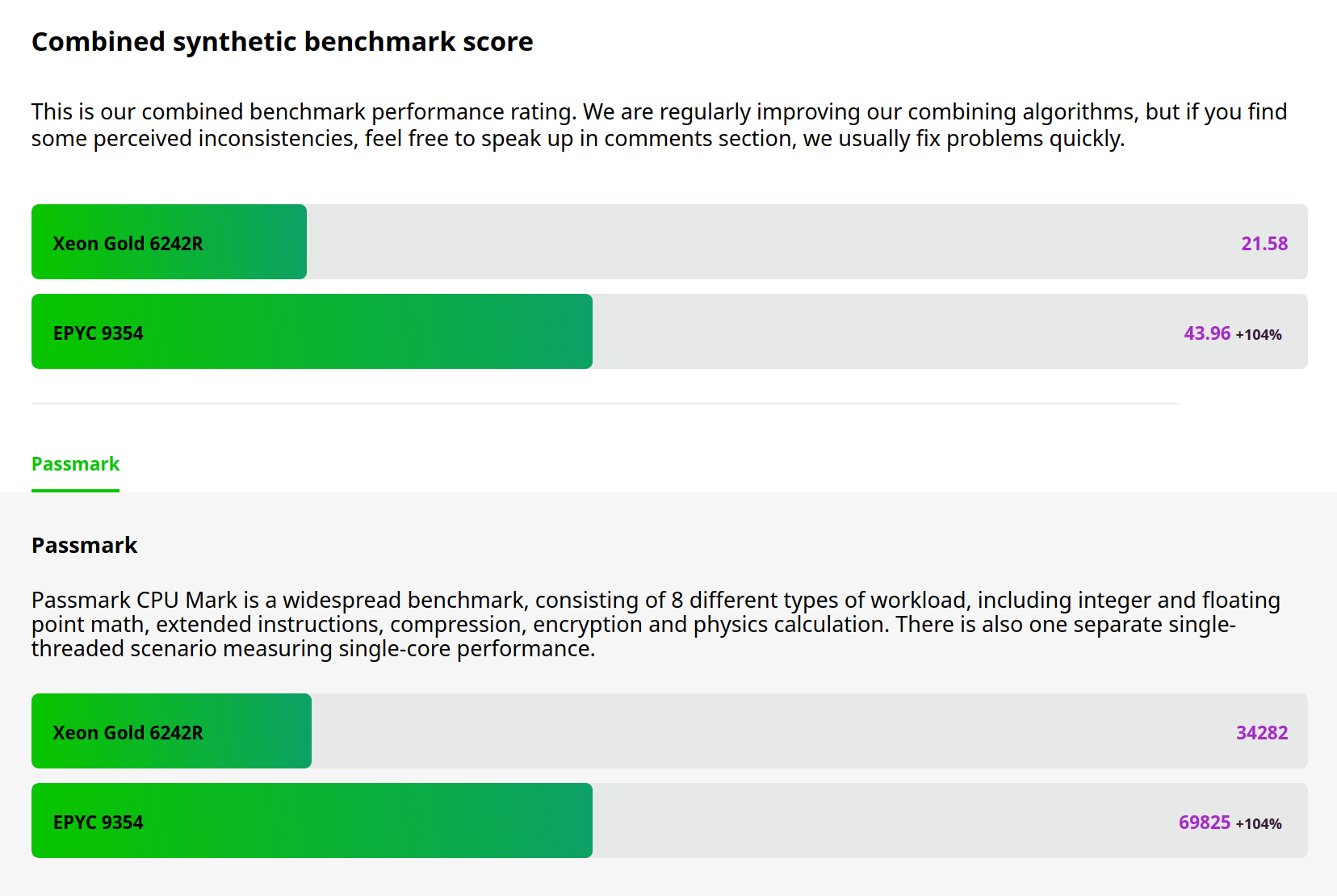 Nous conservons la même politique hardware : aucun compromis sur les performances. Les nouveaux AMD Epyc 9354 affichent de meilleures performances dans tous les domaines ainsi qu’une bande passante mémoire qui passe de 140.8 à 460.8 GB/s